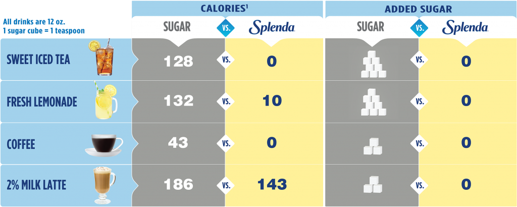 Calories are found in all foods and provide our body with the energy it needs for our daily activities. Most adults need about 2000 calories per day, but this can vary based on your age, body size and type, and activity level. Many people consume more calories than they realize by choosing foods with added sugars, which provide empty calories. Empty calories are those that don’t provide any nutrient benefits and are not needed in your daily food intake. Making a sweet swap with Splenda Sweeteners can help you eliminate empty calories in some of your favorite foods and drinks, as shown below.